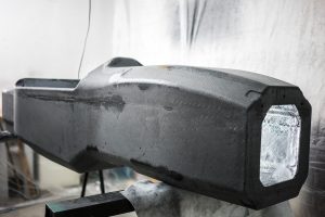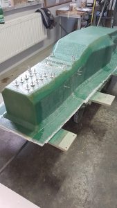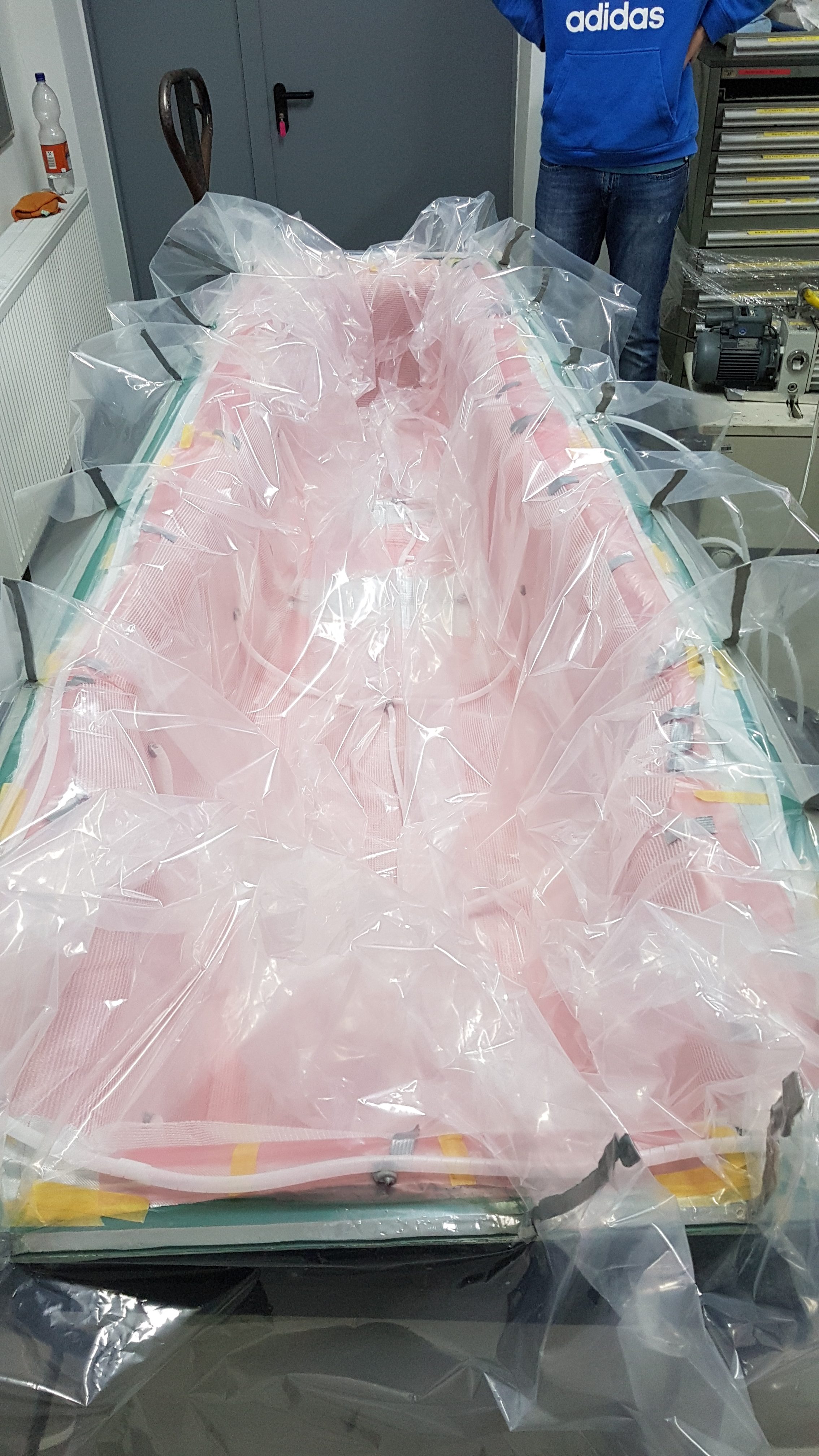 Für die Fertigung wurde in diesem Jahr eine Positivform aus Ureol bei Modelltechnik Rapid Prototyping GmbH gefräst, aus der wir anschließend eine Negativform aus GFK hergestellt haben. Dazu hat uns Hans Rinn e.K. seine Werkstatt, Materialien, sowie sein Wissen zur Verfügung gestellt. In die Negativform wurden daraufhin die ersten Lagen Carbon mittels Vakuuminfusion laminiert und anschließend die Aluminiumwaben eingeklebt. Danach wurden diese noch einmal mit Carbon einlaminiert.
