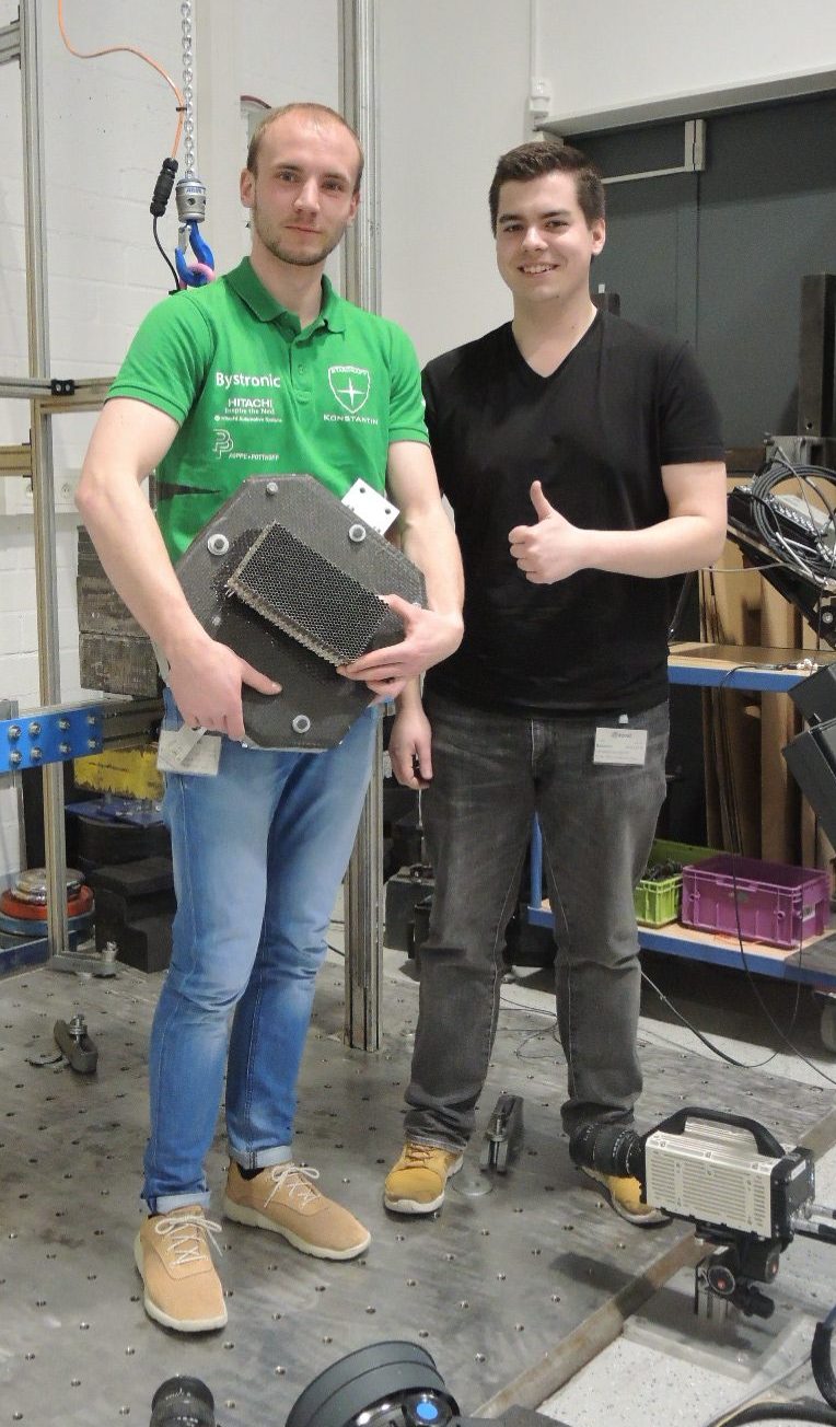 Auch für einen möglichen Frontalzusammenstoß haben wir Sicherheitsvorkehrungen getroffen. Hierzu wurde unter der Nase des Fahrzeugs eine Aluminiumwabe angebracht, die die Energie beim Aufprall aufnimmt. Diese Aluwabe sitzt auf einer Carbonplatte, die ebenfalls in der bereits beschriebenen Sandwichbauweise gefertigt wird. Um sicherzustellen, dass die Platte nicht bricht, wurde bei einem Prüfstandstest bei der EDAG GmbH die maximal aufzunehmende Energie erforscht.