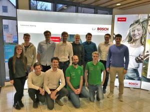 Am Montag den 20.11.2017 waren wir von Bosch nach Schwäbisch Gmünd zu einem Workshop über mechanische Konzepte für die Umsetzung autonomer Lenkung eingeladen. Nach kurzer Begrüßung und leckerem Mittagessen, bei dem wir uns mit den Mitarbeitern von Bosch Automotive Steering und den Mitgliedern unsere Formula Student Freunde von Starkstrom Augsburg über autonome Lenkung und andere Themen austauschen konnten, begann der Workshop. Es wurden mögliche Aktuatoren und Sensoren vorgestellt, die Bosch Automotive Steering für die Umsetzung von Lenkungsunterstützung, Steering-by-Wire und demnächst auch bei autonomen Fahrzeugen einsetzt. Sicherheitskonzepte dieser Systeme waren ebenso Thema wie die geschwindigkeitsabhängige Regelung der Lenkung. Wir konnten einiges für unsere aktuelle Lösung der Lenkung und Vereinfachungen für den Einbau autonomer Lenkung in zukünftigen Fahrzeugen mitnehmen. Wir bedanken uns ganz herzlich bei den Mitarbeitern der Robert Bosch Automotive Steering GmbH für die Einladung und den Workshop.