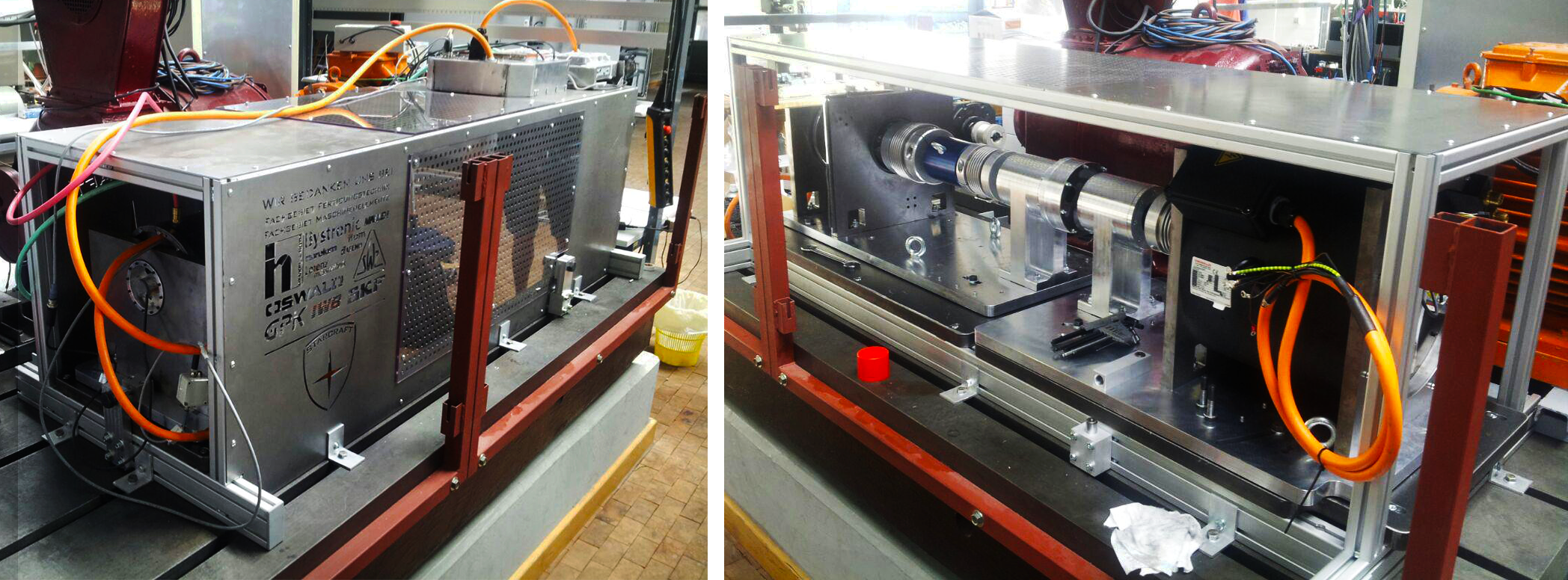 Im Rahmen einer umfangreichen studentischen Arbeit entstand in den vergangenen eineinhalb Jahren unser neuer Motorenprüfstand. Der Prüfstand besteht aus einem Bremsmotor und einem Testmotor. Das besondere daran sind seine erweiterten Möglichkeiten zur Prüfung von Antriebsgelenken. Um dies umzusetzen wurden die Antriebsstränge so in ein Gestell integriert, dass die zu prüfenden Gelenke auch mit angularem und axialem Versatz belastet werden können. Das ermöglicht uns, die Gelenke optimal auf die zu erwartenden Belastungen im Rennbetrieb auszulegen und im Voraus auf Ihre Zeitfestigkeit zu prüfen.