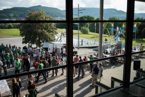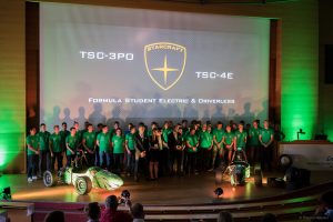 Nach der Präsentation wurden die neuen Rennwagen, der TSC-4E und dem TSC-3PO, vor dem Humboldtbau ausgestellt, um dort von unseren Gästen betrachtet werden zu können. Am Ende kamen Dank des leckeren Essens und den spannenden Gesprächen noch einmal alle zusammen und konnten so miteinander den Abend ausklingen lassen.